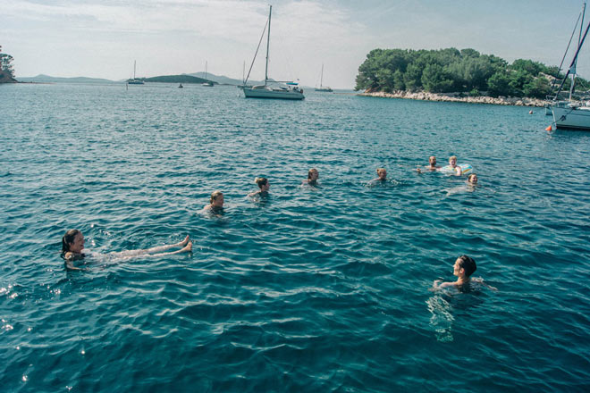 redpepperrice, ratatouille, roasted octopus and cevapcici, of course. Thanks to our friends of „geileweine.de“ we had a few other bottles of tasty wine, and with the bottles getting emptier and emptier, the laughter became louder and louder. At some point the candles went out, everybody was laying on the wooden deck and staring in the sky full of stars. It became silent. A weird feeling after a week with nine people on our Liv. It was never silent. But seeing the Milky Way reflected in the sea is quite impressive. Later, we’re all back in the cockpit, sitting around, smoking and drinking again. The sound of the fantastic Red Hot Chili Peppers is as loud as the laughter, when the first of us jumped into the water.