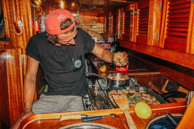 The chicken gets marinated with lemon grass and chili, the sweet potatoes find their way into the oven. The grill is on fire! The crew gets comfortable at the foredeck. The crown corks pop off from cider and beer, blue sky, sea gently burbles, sun is shining.