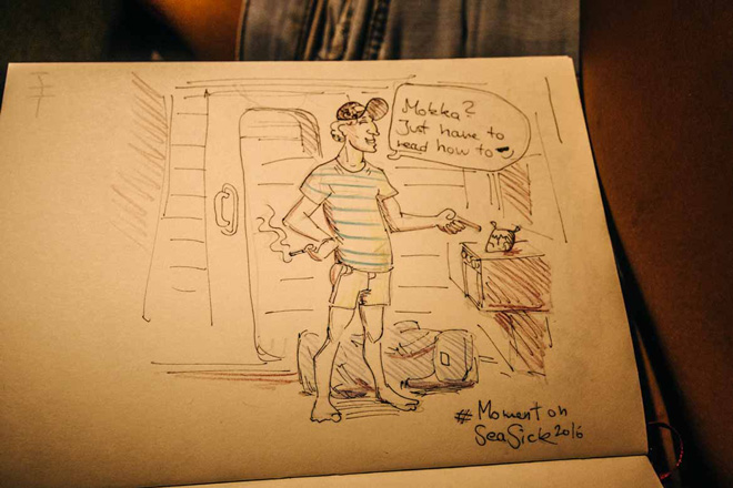 And he discovered the thing we love the most about a night swim. Luminescent plankton around you in the water! Not Bad! Mother nature, weloveyou! –Splash – Splash –Splash- the others followed him into the water. Two of us are sitting at half height of our mast, where you are closer to the stars. And you can see the plankton reacting to all the people swimming around Liv. The first clothes fly down the mast, then two screams. 10 meters in the dark, and you have to jump quite a distance! That’s thrilling! Then two loud splashs, luminescent plankton everywhere, warm water! You break the surface of the water, see the stars! Look to your mate, High Five! Just SICK. SEASICK.