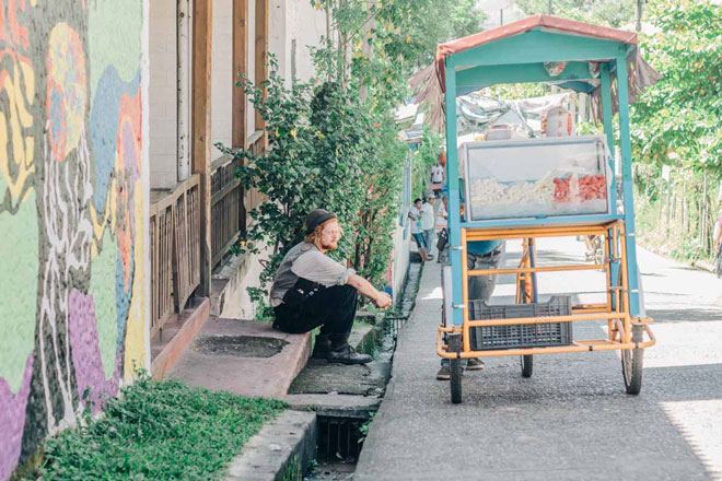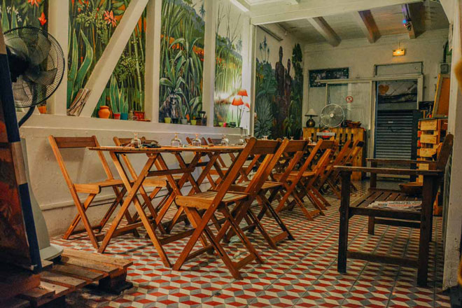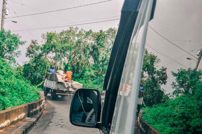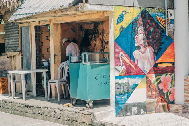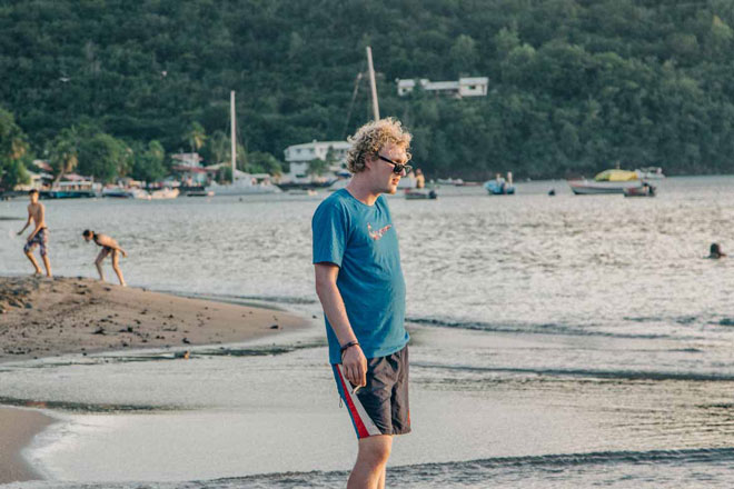 We meet Joe while we're sitting on a bench, drinking cold beer. We bought it at the bar on the other side of the road and enjoy the sunset sipping it. Joe is the fifth local who walks by, shakes our hands and starts a conversation. The bar is filled with locals and we really stick out with our white skin. Joe is a sympathetic guy, making jokes, laughing a lot and talking about his home. He is a Rasta and lives near the forest, growing his own crops and ganja. He doesn't drink alcohol, eats no meat, applies no chemical fertilizer and only consumes what he grows himself. The dung of his horse living in the garden next door and homemade fluids are everything he uses to fertilize. He smokes ganja everyday, because “the higher you are, the closer you are to God” he says.