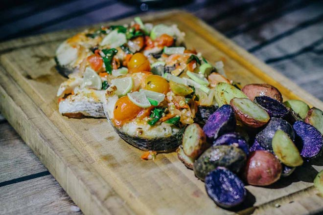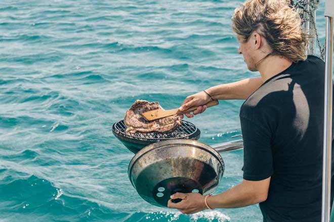 Das Hähnchen wird fix mit Zitronengras und Chili mariniert, die Süßkartoffelecken wandern in den Ofen. Wir schmeißen den Grill an, Pilze und Croutons in die Pfanne. Die Crew macht es sich auf dem Vordeck bequem. Das Steak „smoked“ noch ein wenig vor sich hin.