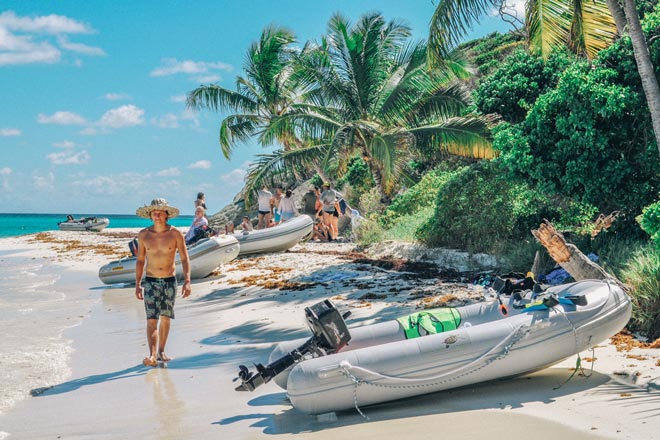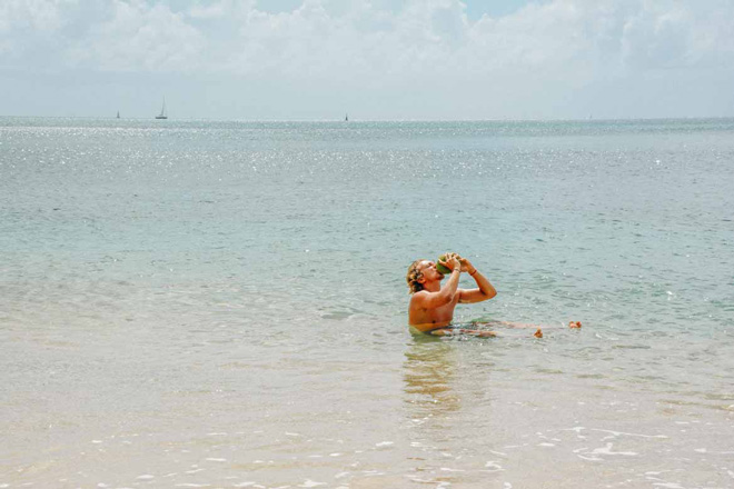 Otherwise the pasta is too salty. After one hour the tourists are gone and all the apples are eaten. Whoever booked the Bahamas-Pig-Tour goes back with lots of piggy-sweet pictures. "What a beautiful day!" We enjoy the unusual silence on the beach as we realize a pig climbing in our dinghi. It bites wildly into the water bottle. The bottle stays closed. We return to LIV and continue sailing. A few weeks later we come back here. This time with Roland. He sees a pig peeing and immediately there arrives a second pig, which drinks its urine.