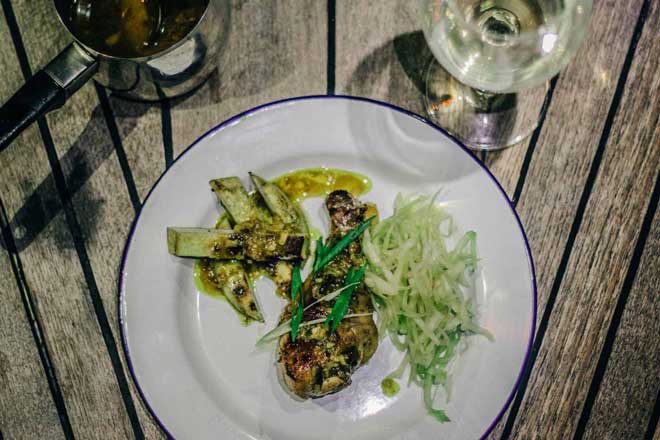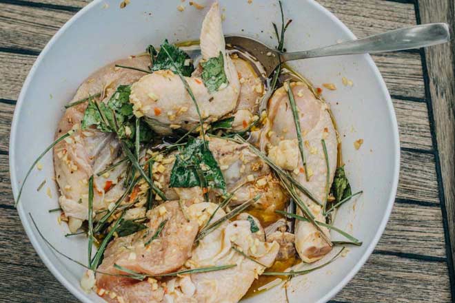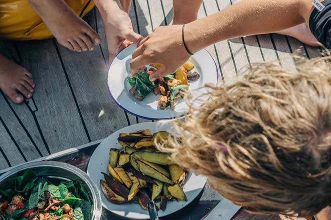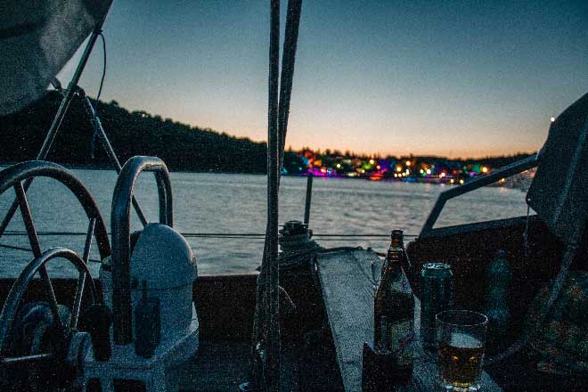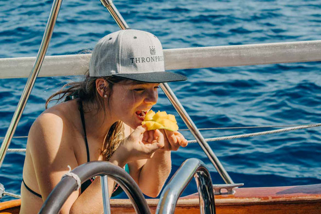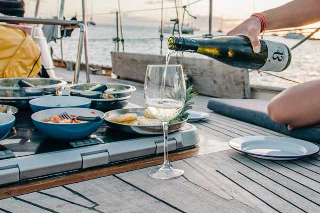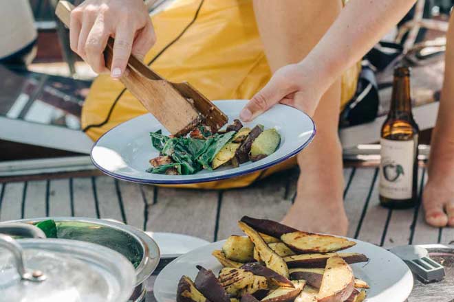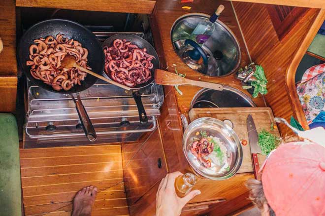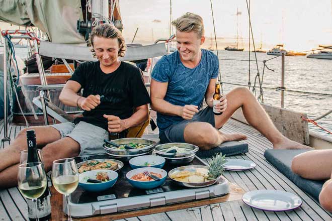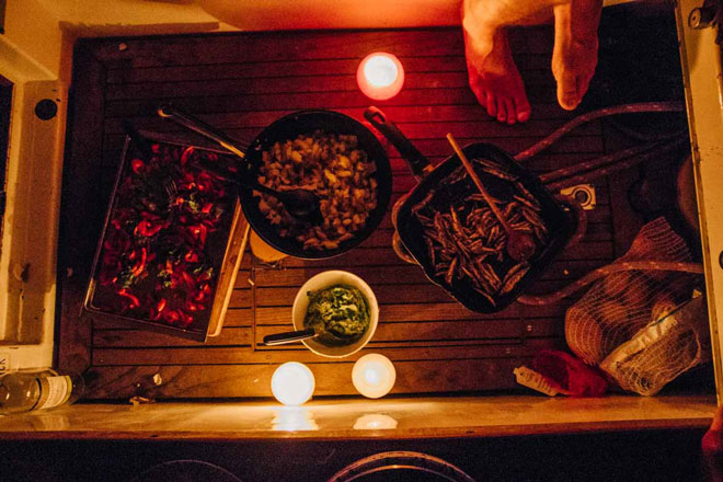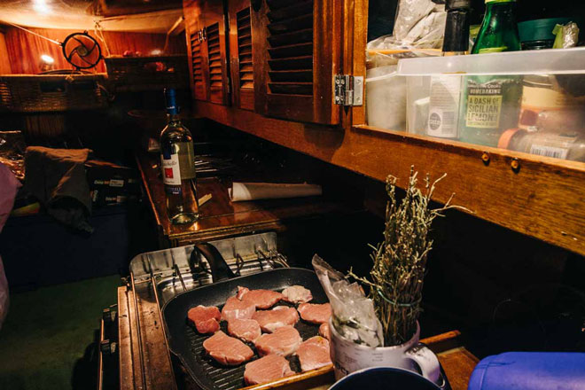 The chicken gets marinated with lemon grass and chili, the sweet potatoes find their way into the oven. The grill is on fire! The crew gets comfortable at the foredeck. The crown corks pop off from cider and beer, blue sky, sea gently burbles, sun is shining.