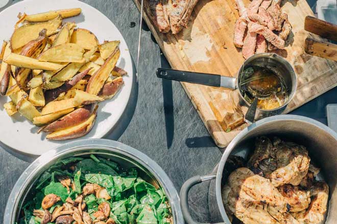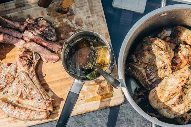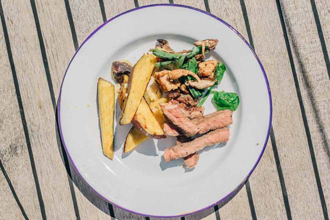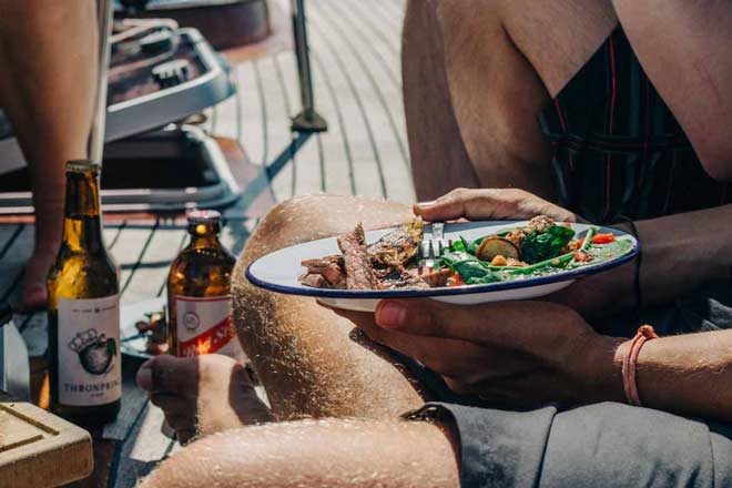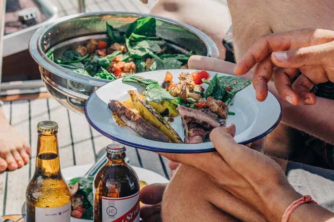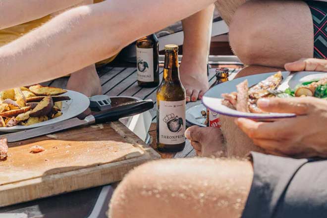 Die Kronkorken fliegen von Cider und Bier, blauer Himmel, leichtes Plätschern, Sonnenschein. Das Fleisch wird in feine Streifen geschnitten und bevor sich jeder seinen Teller voll lädt, greifen wir mit bloßen Händen zum Fleisch. Perfekt! So soll es sein, wir als Crew erleben das Einfache ganz groß.