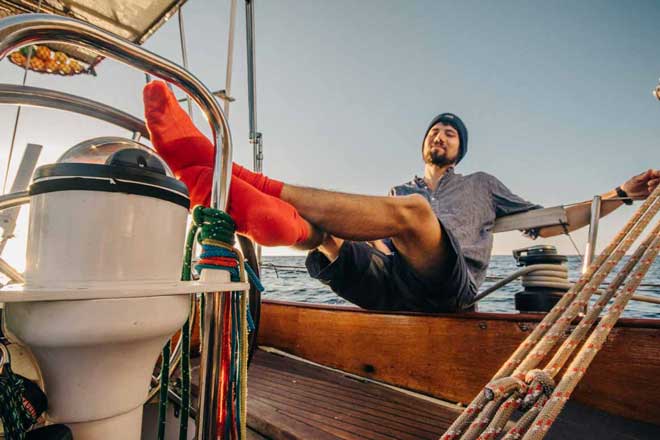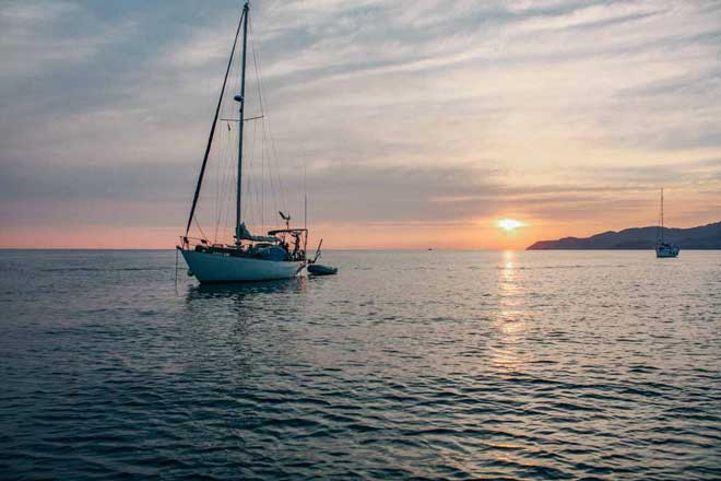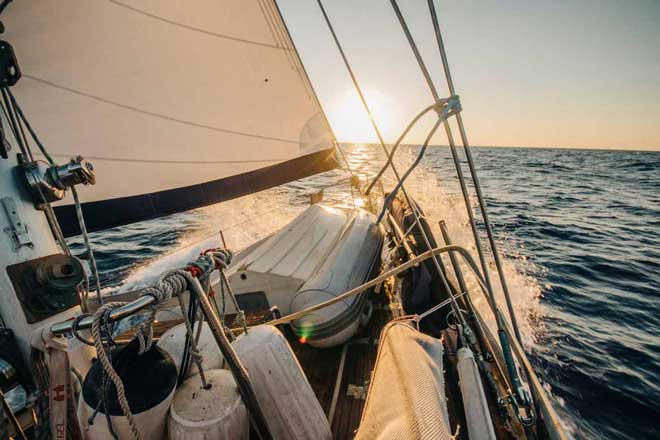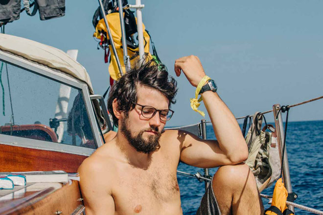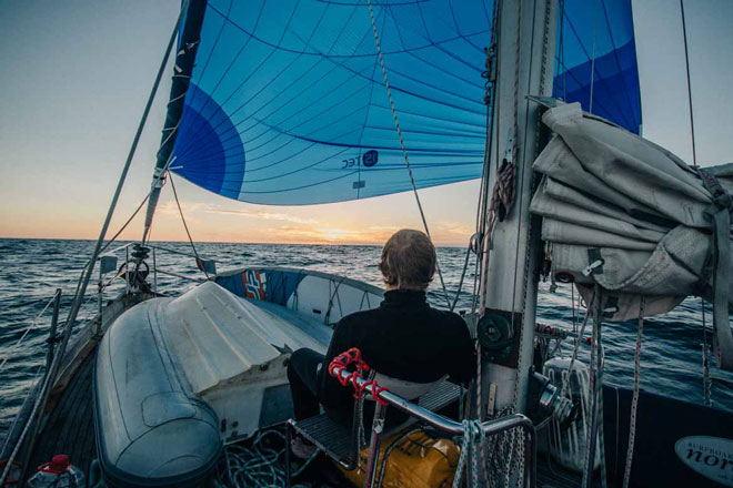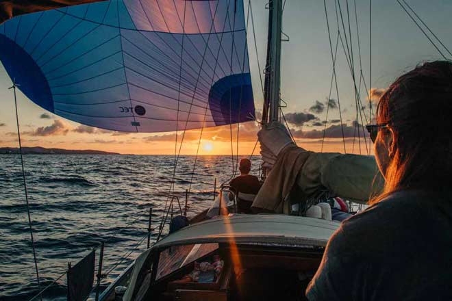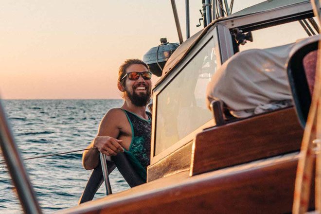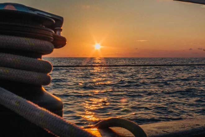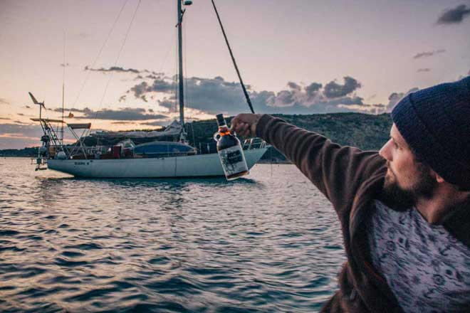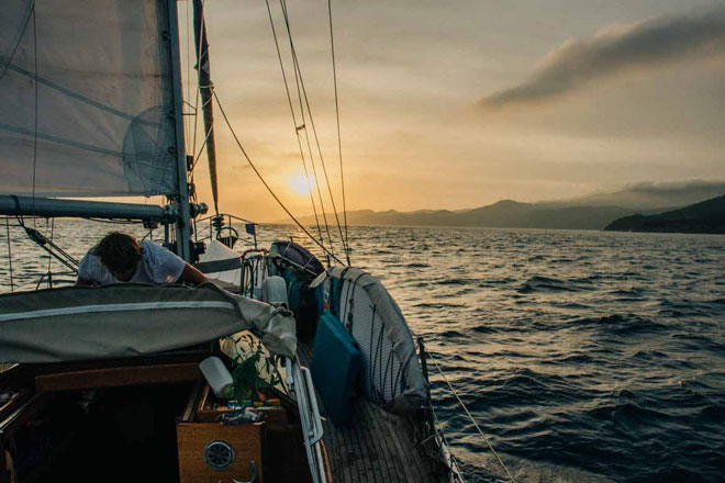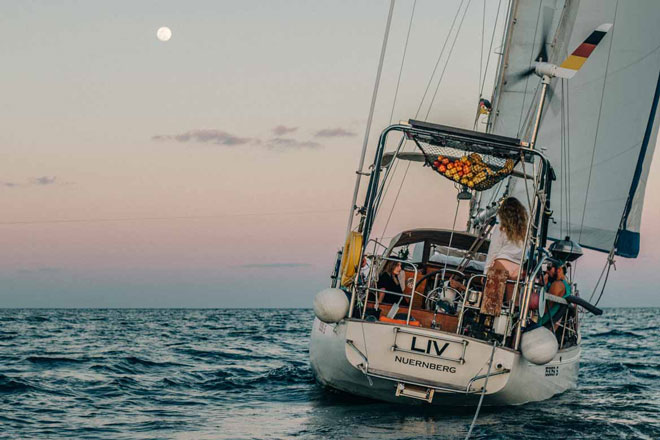 Sailing west, day and night, to get closer to the Caribbean. Step by step. Our first goal was to reach Sardinia, and this is what we managed right now! We reach a beautiful little bay in the south-east of Sardinia. The anchor drops. Quickly we throw our stuff in LIV`s small tender: Blanket, peace pipe, two bottles of wine, our speaker and the camera for sure! Then five boys jump in. One of us is already swimming. The tender would be big enough for 6 guys, but the water has such a nice color you just want to jump in! We climb the rocks on the edge of our bay and watch the sun going down.