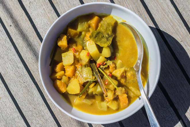 Frisches Fisch Filet mit Zitronengras und Limette auf unserem "Kuba" Curry aus Süßkartoffeln, Ananas und Kokosnuss