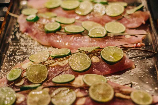Fresh fish filet, seasoned with fresh pepper, lime, garlic, lemon grass and salt