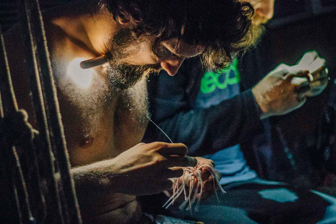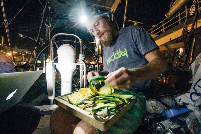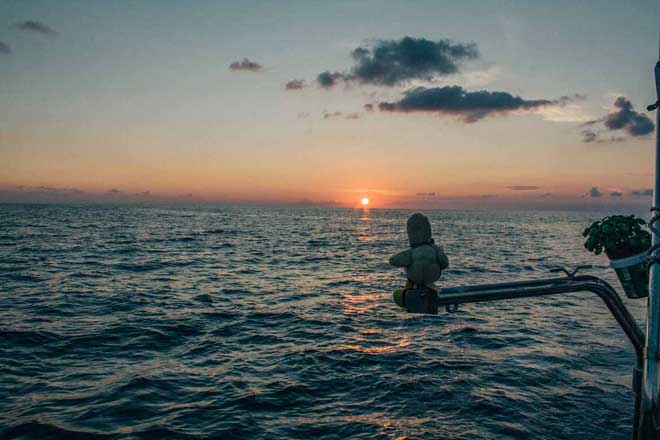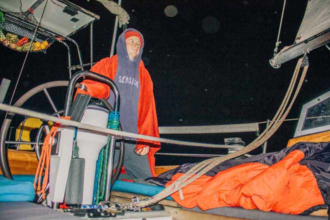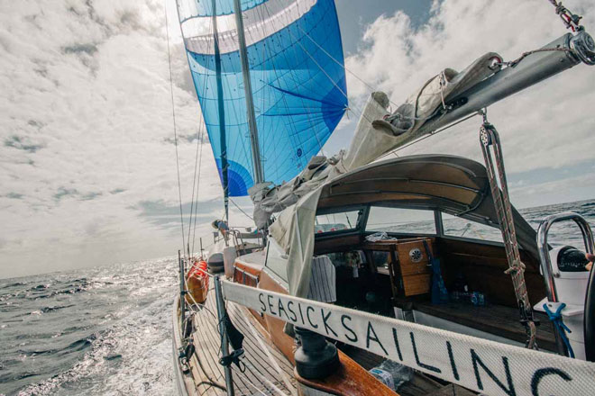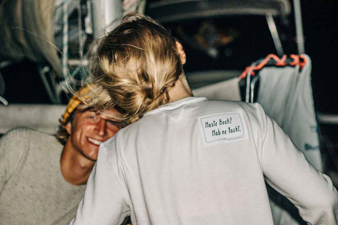 And he discovered the thing we love the most about a night swim. Luminescent plankton around you in the water! Not Bad! Mother nature, weloveyou! –Splash – Splash –Splash- the others followed him into the water. Two of us are sitting at half height of our mast, where you are closer to the stars. And you can see the plankton reacting to all the people swimming around Liv. The first clothes fly down the mast, then two screams. 10 meters in the dark, and you have to jump quite a distance! That’s thrilling! Then two loud splashs, luminescent plankton everywhere, warm water! You break the surface of the water, see the stars! Look to your mate, High Five! Just SICK. SEASICK.