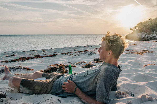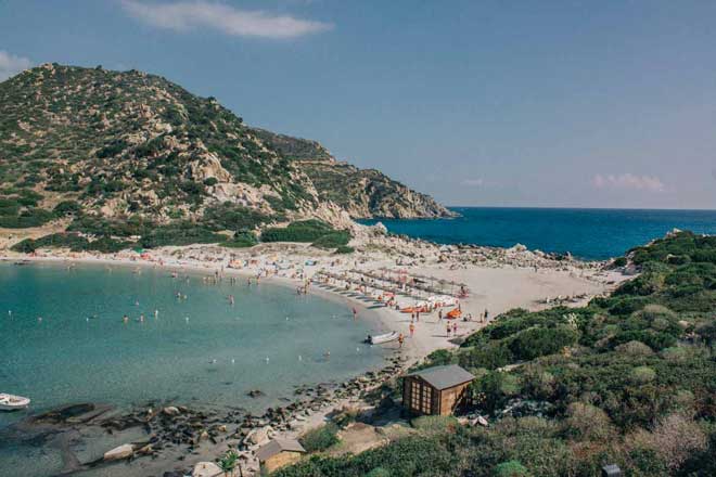 Immer Richtung Westen. Mit jeder Seemeile ein Stückchen näher in Richtung Karibik. Bis dahin liegen aber noch einige Etappenziele vor uns. Step by step. Erstmal Sardinien schaffen - und das haben wir jetzt! Im Südosten dieser bergigen Insel werfen wir unseren Anker in einer traumhaften Bucht. Schnell wird das Dinghi gepackt: Decken, unsere Friedenspfeife, zwei Flaschen Wein, unsere Musikbox und die Kamera. Dann folgen noch fünf Jungs, Paddel und los geht’s zum Strand. Der sechste hat Bock zu schwimmen, also schwimmt er. Das Wasser schimmert schon mächtig türkis in der Abendsonne. Wir ziehen das Dinghi auf den weißen Sandstrand und klettern die Felsen auf der Landzunge herauf. Es ist der südlichste Zipfel der Bucht mit Blick auf die untergehende Sonne.