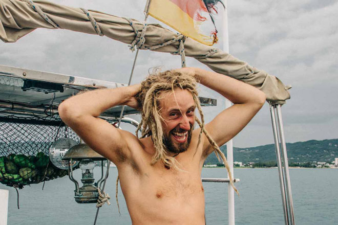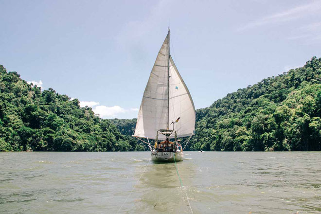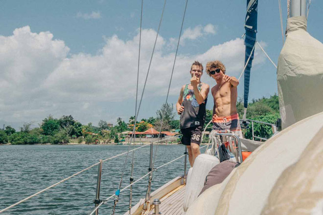 That's enough. Good old Germany is calling. The water here has reached its 26 degrees. Maybe the worst hurricanes the Caribbean has ever seen will pass through soon. Let's get out of here. But first we‘ll take LIV to a nice, quiet place. We'll sail to the Rio Dulce in Guatemala. 900 nautical miles from here. We’re sailing through the Bahamas in south-east direction and sail on until we drop the anchor in Santiago de Cuba. For a few days Morten and Marius, two journeymen from Germany have been waiting here for us with an almost expired visa. Two Months before we met them in Varadero, Cuba and since then they worked and travelled through Cuba. Now they want to leave and continue their adventure in Central America. They do not fly, have no mobile phone, no money and work for board and lodging. They packed their seven things together in cloths and tied them on a wooden frame, which they built themselves. Their traditionnal costume is ticket, work clothes and sleeping bag in one. Marius, aka the Rasta, has been on the road for four years now. After three years he would be allowed to return home according to the tradition. His mother would be happy. But now he’s sailing with us to Jamaica. And then to our final destination in Guatemala. Rio Dulce is a hurricane save spot between the mountains in Guatemala a Norwegian sailor recommended us.