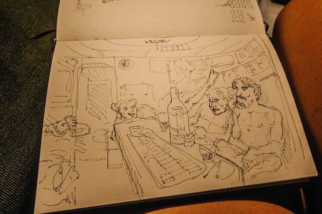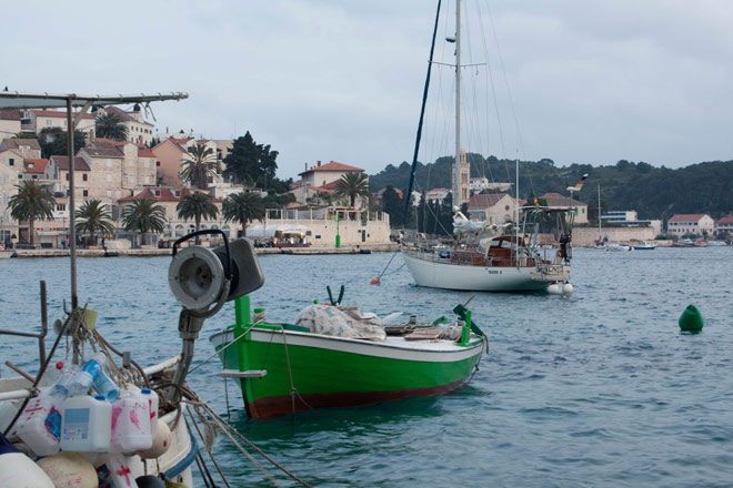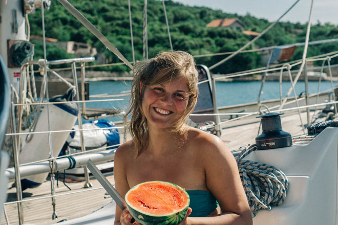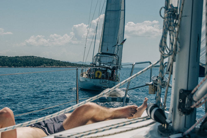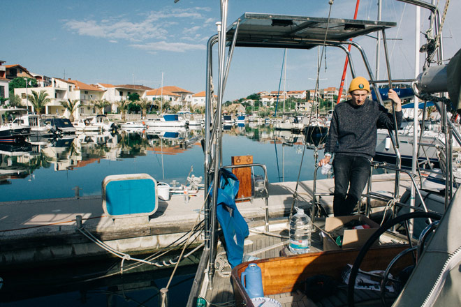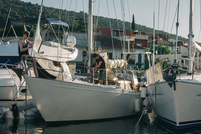 redpepperrice, ratatouille, roasted octopus and cevapcici, of course. Thanks to our friends of „geileweine.de“ we had a few other bottles of tasty wine, and with the bottles getting emptier and emptier, the laughter became louder and louder. At some point the candles went out, everybody was laying on the wooden deck and staring in the sky full of stars. It became silent. A weird feeling after a week with nine people on our Liv. It was never silent. But seeing the Milky Way reflected in the sea is quite impressive. Later, we’re all back in the cockpit, sitting around, smoking and drinking again. The sound of the fantastic Red Hot Chili Peppers is as loud as the laughter, when the first of us jumped into the water.