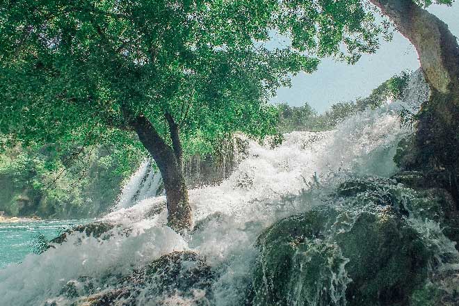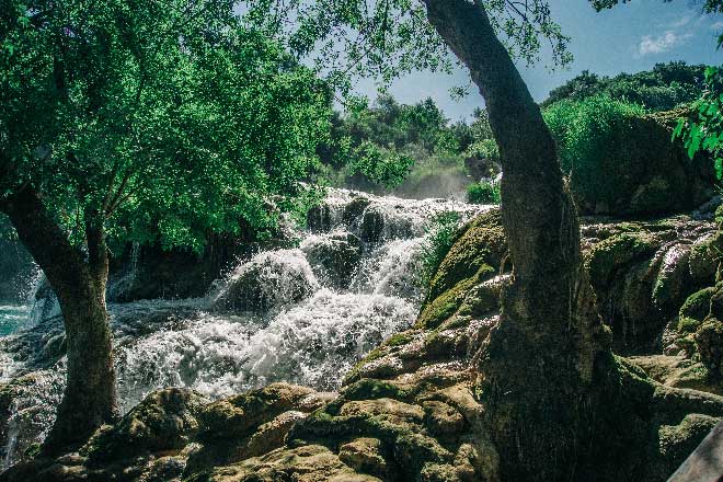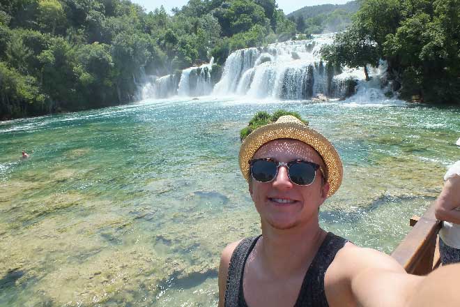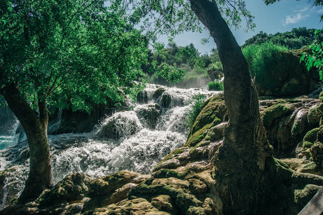 First of all: this is no insider’s tip! This is a spot everybody knows about, but still, it’s one of our „must haveseen“ spots! It starts with the exciting way sailing upstream the river Krka, through high cliffs until we reach the small town of Skradin. Here we have to leave Liv, and we enter a touristboat which takes us into the Krka National Park. As we told you, we normally try to avoid mass tourism, but sometimes there’s no otherway. The lowest and biggest cascade lead sto a big bassin, and we define, that swimming is probably allowed. We take off our shirts and jump into the water. It’s wonderfull!