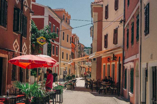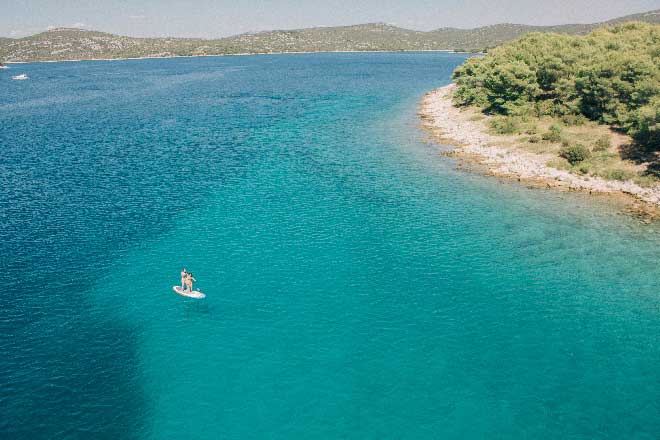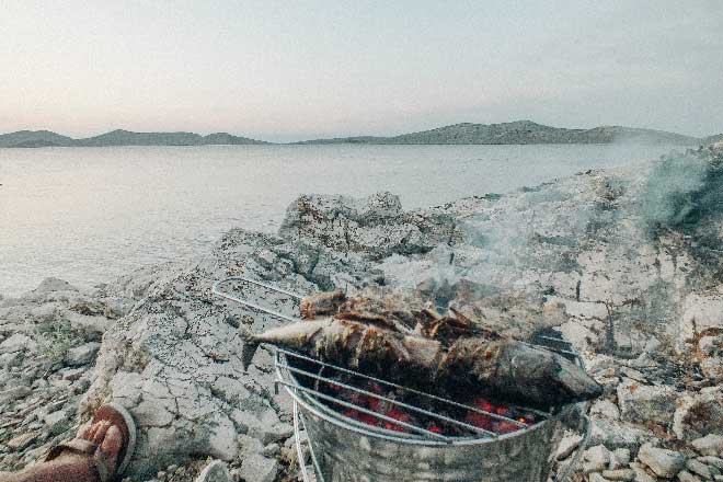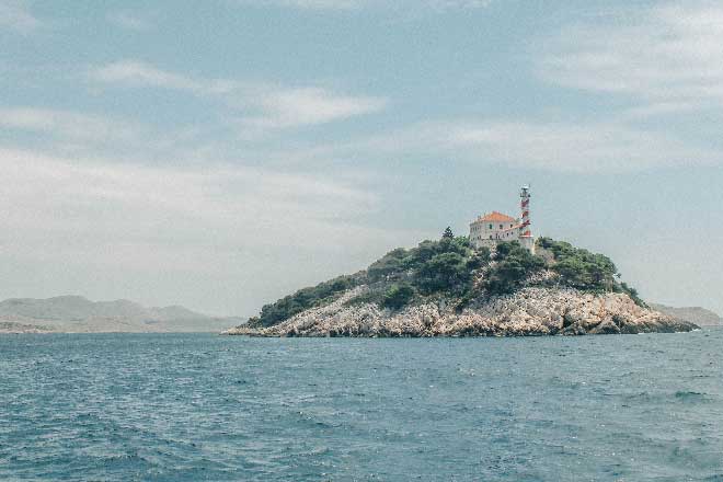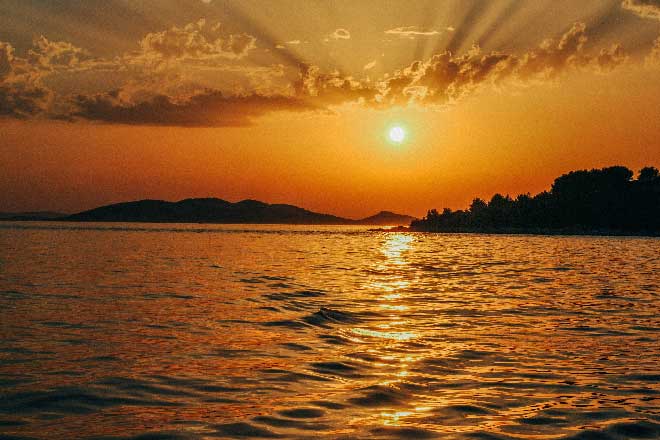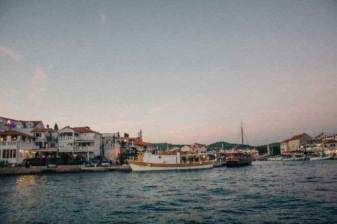 Von der Promenade eine Arschbombe ins glasklare Wasser, kein Problem, macht der Barbesitzer auch. Kurz vor Sonnenuntergang verlässt man die Altstadt am besten über die kleine Brücke, und besteigt den kleinen Hügel am Festland. Von der kleinen Kapelle am Gipfel sieht man die Sonne hinter den Hügeln der Kornaten untergehen und am Horizont glitzert das offene Meer. Der Weg zurück ist nicht weit, die Straßen sind voller Menschen und die Musik ist laut. Eine typische Konoba findet sich schnell. Bei leckerem Wein und dem traditionellen Grillteller beginnt der Abend denkbar gut.