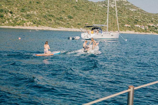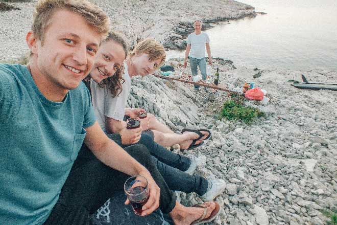 It’s fridaynight, in a crystal-clear bay near Tisno. Right next tous a small, nameless island. The crikets stopped chirping hours ago, and our world has become silent. Time to unroll our day; a day which describes perfectly our time here in Croatia. We set sail around midday and sailed to the next beautiful bay. We droppped the anchor, put on our trunks and jumped into the turqoise sea. Swimming, snorkelling, stand-up paddling, relaxing. A normal day in paradise. Then, just a few hours ago, at sunset, somebody started cooking, before everybody took their usual spot in the forship area. The first cork popped, an outstanding German champagne named „Dicker Fritz“! Perfect! Somebody brought our dinner: