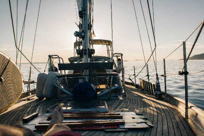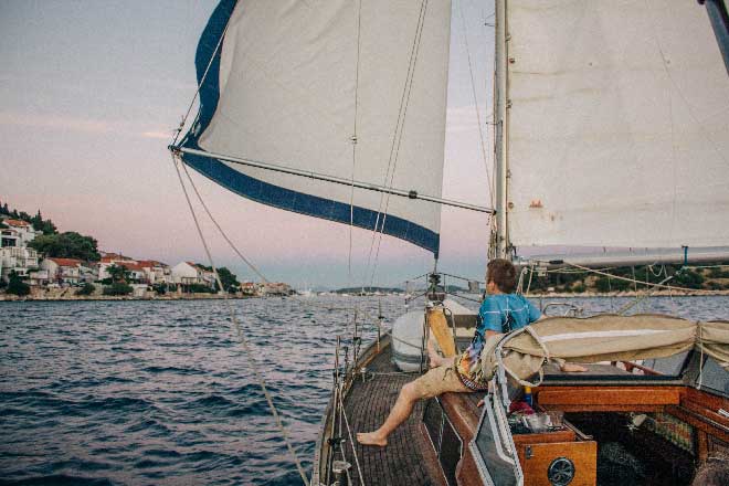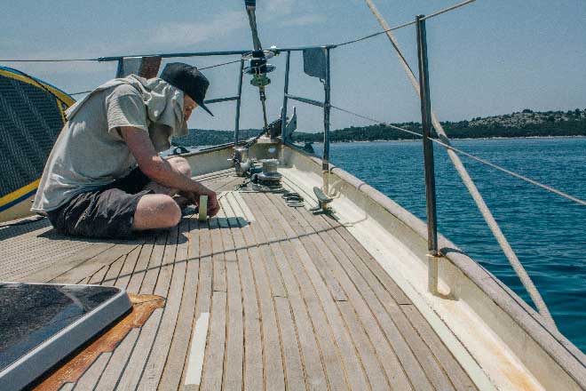 Erst die Arbeit, dann das Vergnügen. Decksreparatur steht an. Klingt schön. Die Fugen zwischen den Teakholzstäben sollen ausgebessert werden. Dummerweise hat der Vorbesitzer das Teakdeck immer eingeölt. Sehr sehr schade, weil dadurch die Fugen spröde, weich und teilweise undicht geworden sind. Auf ein undichtes Deck haben wir so gar keinen Bock. Stell dir vor es regnet heftig ein paar Stunden lang mit 40 Liter pro Quadratmeter oder so und das Wasser läuft dir ins Schiff - dann geht unser Schiff ja sofort unter. Gar keinen Bock auf so was. Wir haben im Internet gesehen, dass zufällig über die ganze Woche hinweg in Tisno ein Electro Festival ist. Tisno ist ebenfalls auch auf der Insel Murter, also nur einen Yachtsprung entfernt. Das könnte gut werden! Entspanntes Segeln an der Insel entlang versüßt uns den ersten Abend.