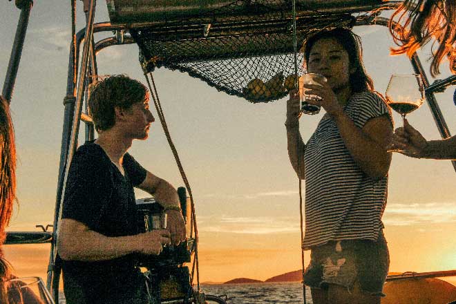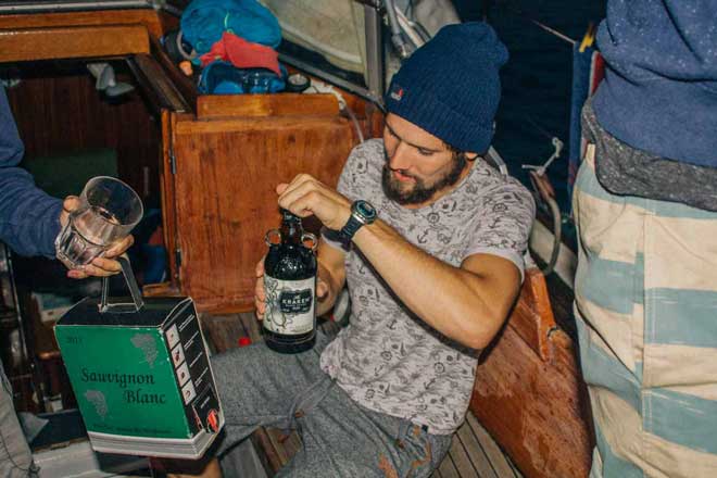 Dazu gebratenen Oktopus und natürlich Cevapcici! Wir sind ja in Kroatien. Dank unseren Freunden von „geileweine.de“ stehen noch einige andere Flaschen Wein herum. Die werden schnell leer, das Lachen lauter, perfekte Momente. Irgendwann gehen die Kerzen aus, alle liegen da, schauen in den Sternenhimmel. Es wird still. Ein komisches Gefühl nach einer Woche zu neunt auf der Liv. Still wars selten. Aber eine sich im Meer spiegelnde Milchstraße hat man auch nicht alle Tage. Das beeindruckt. Normalerweise sind bei uns sechs Personen Maximum. Ist ne schöne Zahl, und mehr Betten haben wir nicht. Aber dann wurden es halt doch ein paar mehr, ein bisschen kuscheln hat noch keinem geschadet. Später sitzen alle wieder hinten im Cockpit. Aus dem Niedergang dröhnen die „Red Hot Chili Peppers“, es wird wieder getrunken und geraucht.