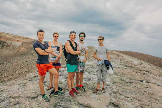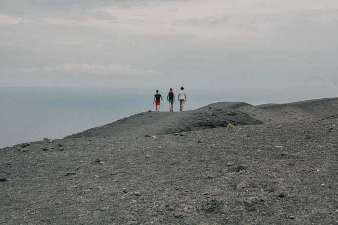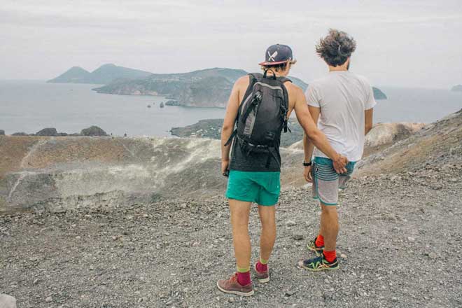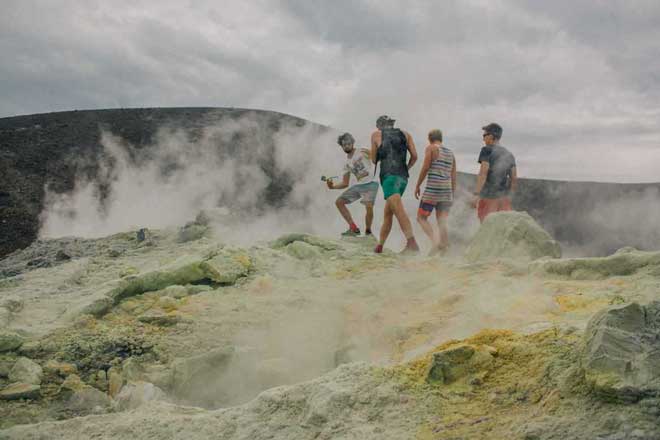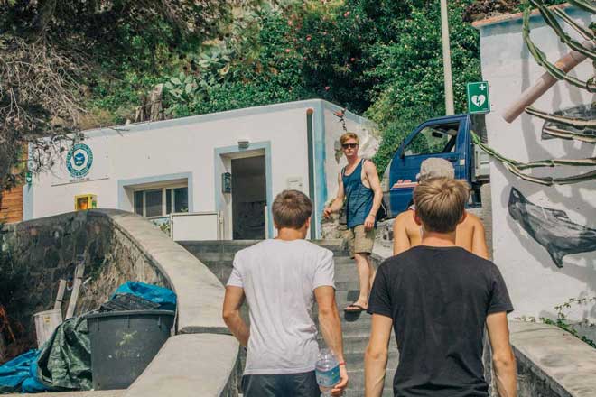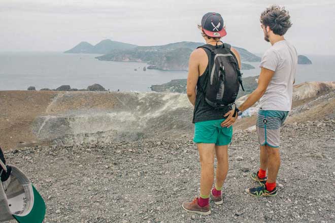 After we paddled to the beach we started our hike to the crater which we reached faster than expected! It's impressive how different nature can be on such a small island! On our way up we passed everything between cactuses, palms, jungle and dusty desert filled with rocks. The closer we got to the crater the stronger the stronger the air smelt of sulfur, which was quite annoying. But it was absolutely worth it, the view from the summit was outstanding! You can see the whole group of the eolian Islands as well as Sicily. The sulfuric damps and the yellow rocks are really impressive, you have to see this! We left the Vulcano behind as and walked downhill, looking for the hot springs.