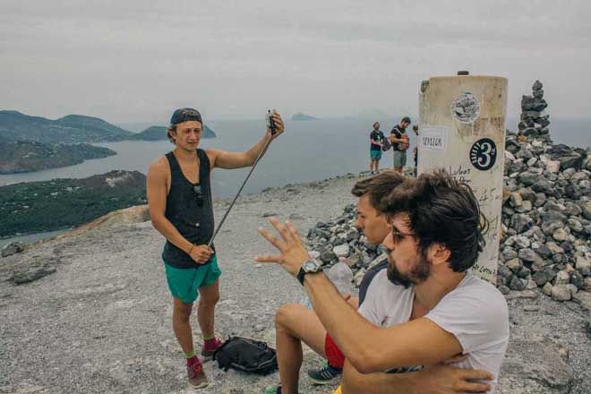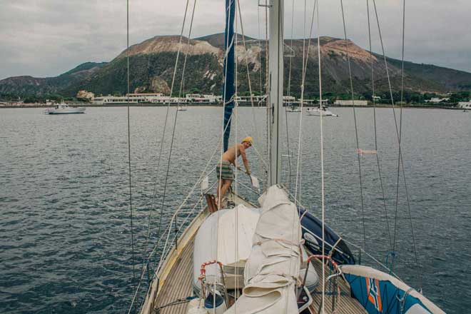 As we planned our trip to the eolian Islands we decided to visit “Isola Vulcano”. It's not quiet as famous as the other eolian we hoped that there were less tourists and it was the closest island to our current position in Sicily. Like you might expect from its name, “Isola Vulcano” is an island with a vulcano, but there's even more than that! We heard that there are some kind of hot springs! On the North-East edge of the island we found a nice little bay with black sand and dropped our anchor. Some other yachts and a nice and old fisherman with his boat were right next to us. Even though he didn't speak a single word of english he sold us some fish – as long as you start to talk to people communication works anyway!