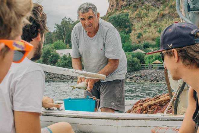Wir reiben uns mit heißem, schweren gelbgrauen Schlamm ein, treiben durchs Wasser und kommen schnell mit einem deutschen Urlauber ins Gespräch. Man sitzt doch sehr nah beieinander. Nach einiger Zeit geht’s zum Saubermachen ins Meer und zackbum, schon wieder was geniales von Mother Nature: ein natürlicher unglaublich heißer Whirlpool im Meer. Einfach so. Was will man mehr?! Wir verzögern die Abfahrt solange es geht, lichten den Anker, setzen Segel und nehmen Kurs nach Westen. Die Sonne verabschiedet sich für heute mit wundervollen Farben und wir genießen frischen Fisch aus der Pfanne. Ade Sizilien.