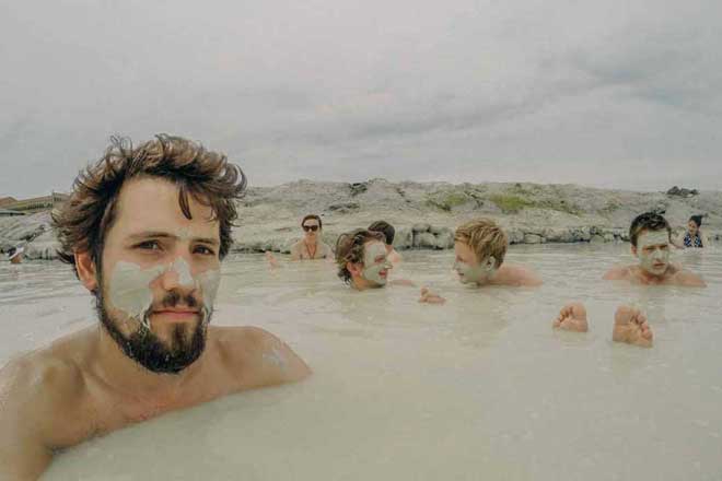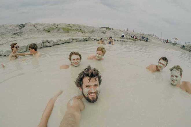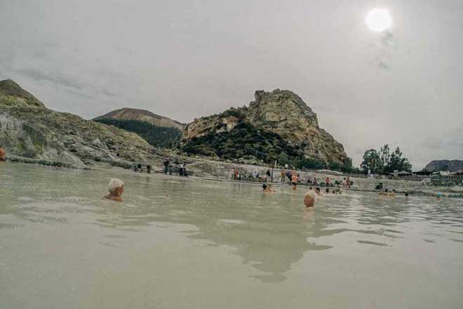 Je weiter man nach oben kommt, desto mehr denkt man an Silvester, denn der Schwefelgeruch wird intensiv. Die Aussicht am Krater ist fantastisch. Wir können die gesamte Inselwelt der Äolen sehen. Schwefelschwaden und die heißen, leuchtend gelben Felsen, aus denen es heraus pufft, kannten wir bis heute noch nicht. Wir sind schwer beeindruckt! Wieder unten angekommen findet sich direkt neben der schönen Ankerbucht, ein wenig zwischen Felsen versteckt, das heiße Schlammbad. Für 3 Ökken setzten wir uns zu den Rentnern in die lauwarme Brühe, brauchen aber ein wenig Eingewöhnungszeit. Es blubbert überall und stinkt ordentlich, aber irgendwie ist es auch ganz geil.