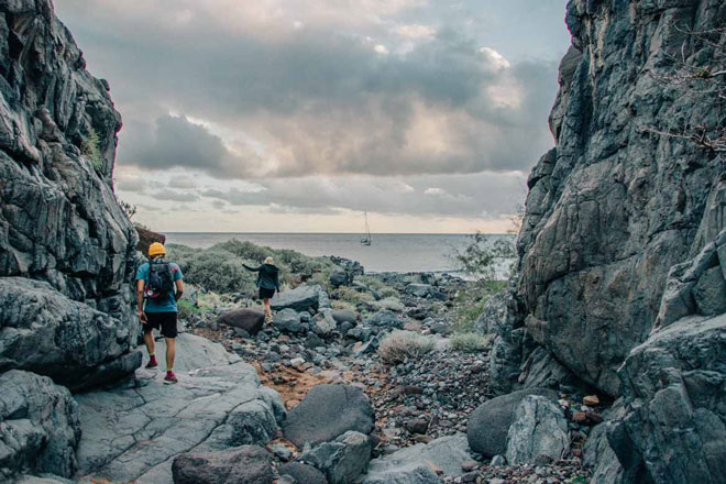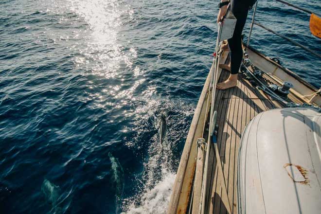 aber am Ende der Kraxelei wartet jedesmal ein neuer Gipfel mit atembreaubendem Ausblick. Ab und an lassen sich Delphine blicken, und wir benehmen uns wie kleine Kinder. Alles wird liegen und stehen gelassen, jeder starrt aufs Wasser, und springt ein Delphin aus dem Wasser, kreischen alle los. Die Uhr hat keiner im Blick, die Tage gehen ineinander über. Erst als Essen und Wein zur Neige gehen machen wir uns langsam auf dem Weg zurück Richtung Küste. Die Sonne im Rücken wird die letzte Pulle geöffnet, während uns unsere Lady den Weg weist.