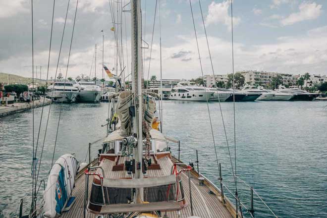 Der Swell in der Bucht steigt und LIV stampft uns in den Schlaf – und stampft und stampft. Der Grund kommt zunehmend näher. Schon ein Meter weniger unterm Kiel. Nur noch 1,7 Meter. Jetzt nur noch 1,1... oh shit, wir müssen sofort hier weg. Die 30 Meter Ankerkette, die wir als 3. Sicherheit auf den Grund gelegt haben, bestätigt unser Gefühl, mit der Tonne abgetrieben zu sein. Sie war schon auf Spannung. LIV schaukelt uns wie ein wildgewordenes Pferd in die noble Marina Ibiza mit ihrem dekadenten Flair. Riesige Masten mit rotem Toplicht, damit Flugzeuge nicht dagegen fliegen, glänzen uns an.