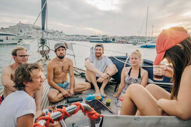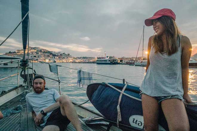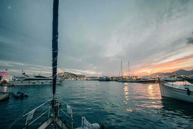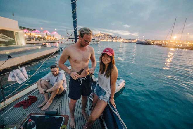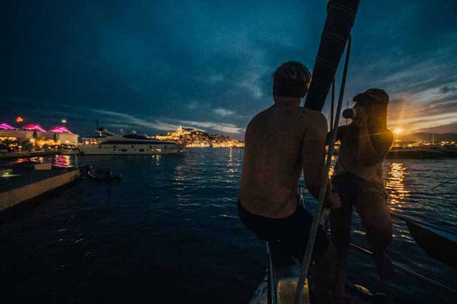Fünf Stunden vor Ibiza erreicht uns die frohe Botschaft von Anh und Felix: „Jo ihr! Ruft uns mal an wenn eure Handys wieder an sind! Sind in Ibiza und freuen uns auf euch! Luv ya and the LIV“. Voller Vorfreude auf ein schönes Wochenende laufen wir um 20 Uhr in der Tamanca Bucht ein und machen an einer Boje fest. Schnell wird das Dinghy zu Wasser gelassen und das SUP aufgepumpt. Wir sind heiß. Anlegen nach 3-4 Tagen auf See weckt in uns neue Energie und Tatendrang. Nach etlichen Telefonaten und einem Trölfhundertmeterlauf von Basti stoßen wir mit Campari auf unsere Companieros an.