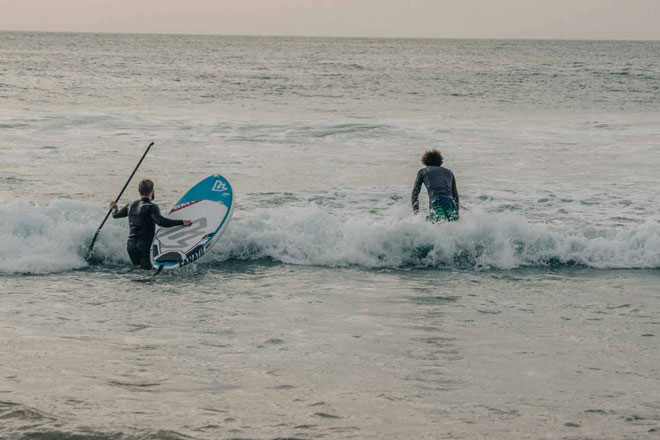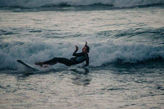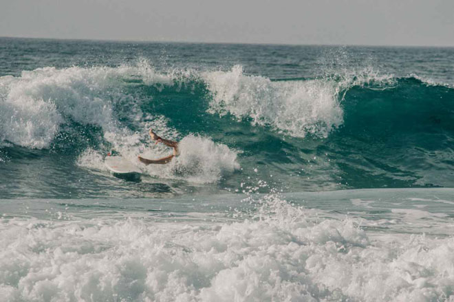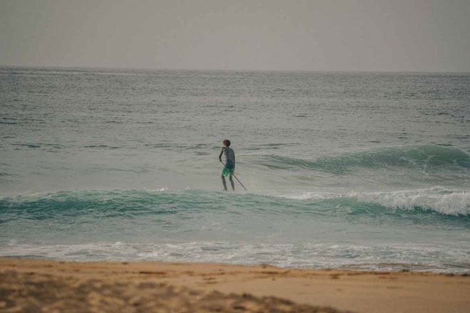 Wir waren leider einen Tag zu spät, denn die Locals erzählen von den gestrigen 2-3 Metern und das ist hier keine Seltenheit! Die Welle ist vornehmlich eine Linke, bricht sich über ein paar Felsen und läuft auf Sand aus. Noch dazu kann man trockenen Fußes bis zum Ende der Bucht laufen und von einem der Felsen hinter das Line Up springen. Wie geil! Sowas spart unheimlich viel Kraft und verlängert somit die Zeit zum Surfen.